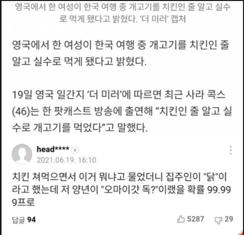 개고기를 먹은 영국인 작성자 정보 하루견과 작성 작성일 2025.10.17 00:52 컨텐츠 정보 117 조회 목록 본문 치킨인 줄 알고 먹은게 개고기 일리가 있냐 ㅋㅋㅋ 관련자료 이전 사자는 토끼를 잡을때도 최선을 다하지 작성일 2025.10.17 00:52 다음 여친등판이 이러면 작성일 2025.10.17 00:52 댓글 0 등록된 댓글이 없습니다. 로그인한 회원만 댓글 등록이 가능합니다. 목록