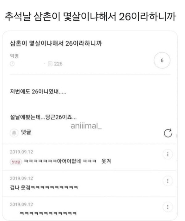 추석날 삼촌이 나이를 물어 봤다. 작성자 정보 나바리 작성 작성일 2025.10.17 10:55 컨텐츠 정보 120 조회 목록 본문 설도 올해고 추석도 올해 이니 나이는 안 먹었겠지. ㅋㅋ 근데 기분이 뭔가 아직도라는 기분은 나도 들긴 해 ㅋㅋㅋ 관련자료 이전 남일 같지 않네..... 작성일 2025.10.17 10:56 다음 어느 효자의 할머니 사랑 작성일 2025.10.17 10:53 댓글 0 등록된 댓글이 없습니다. 로그인한 회원만 댓글 등록이 가능합니다. 목록